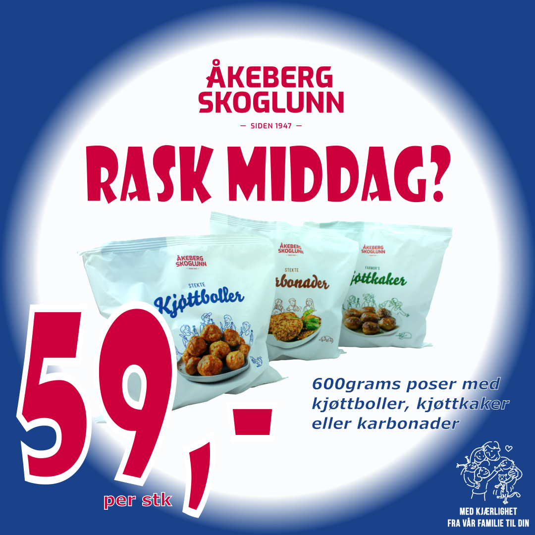 Våre populære poser med 600g kjøttkaker, karbonader eller kjøttboller er igjen ankommet frysedisken vår. for kun 59kr per pose har du mange gode alternativer til middager. Og siden de er fryste kan du planlegge for mer enn en uke også, om du har plass. Disse posene blir fort revet ut av diskene våre og men fylles jevnlig opp. Er din favoritt borte, spør betjeningen vår.